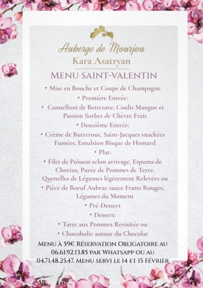 Menu de la Saint-Valentin du samedi 14 février 12h midi et soir et dimanche 15 février midi.